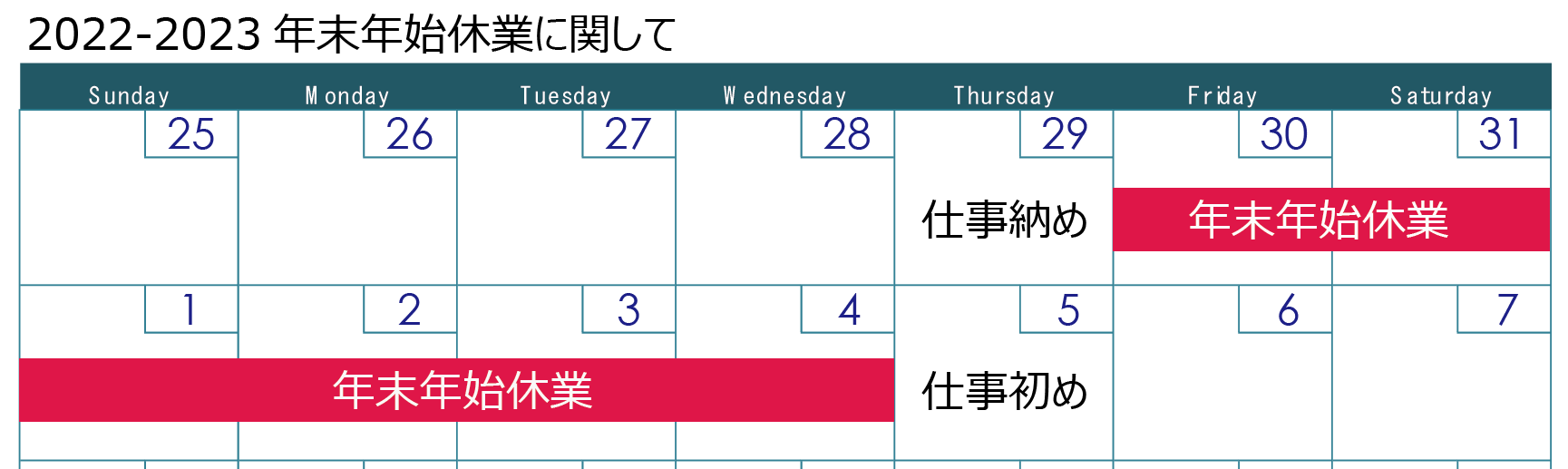 年末年始休業に関して(2022-2023) いつもお世話になっております。年末年始の休業に関してご連絡させていただきます。年内は29日までの営業となります。30日から4日まで休業、5日より営業開始となりますのでよろしくお願い致します。 年末年始休業について